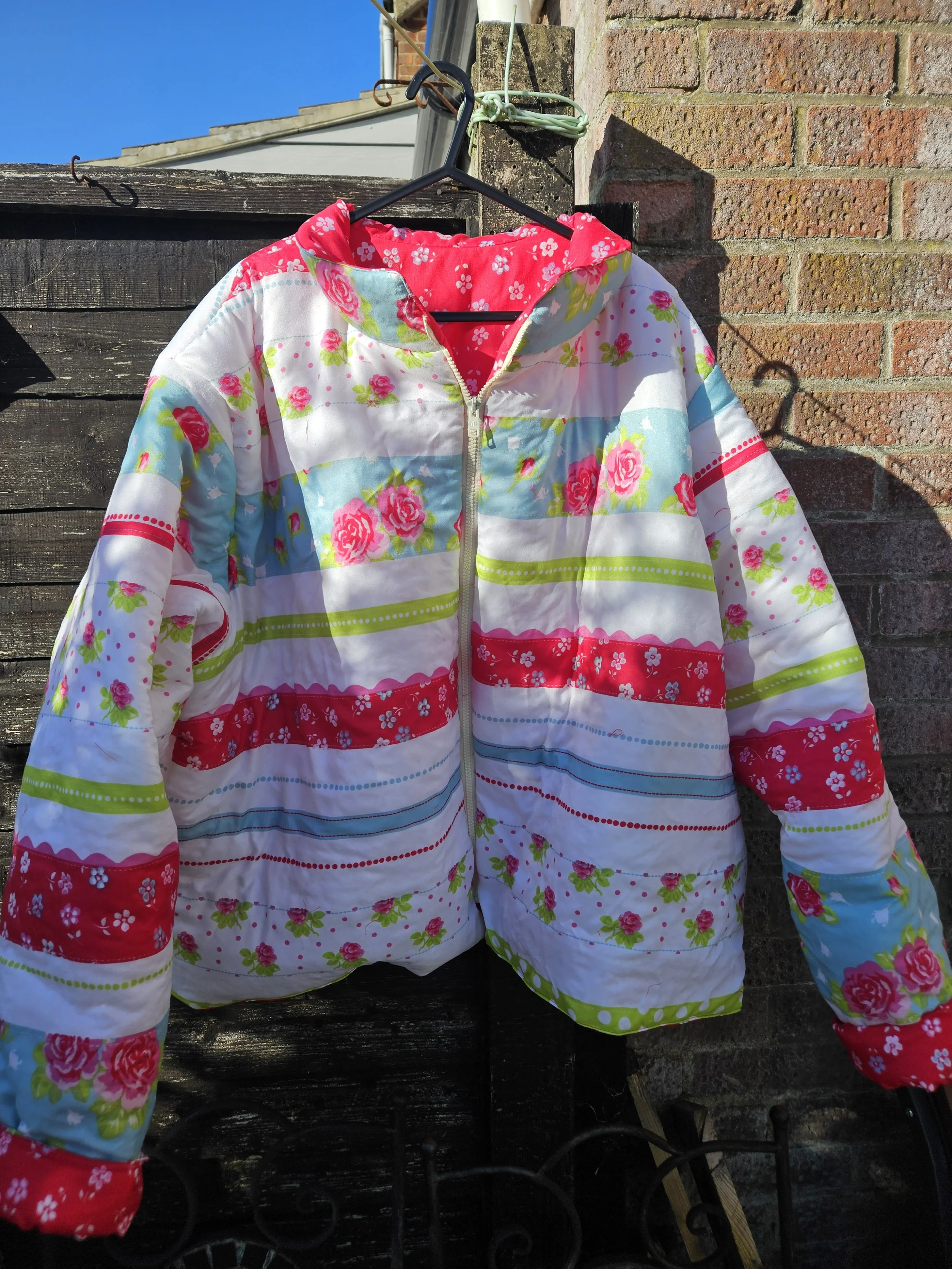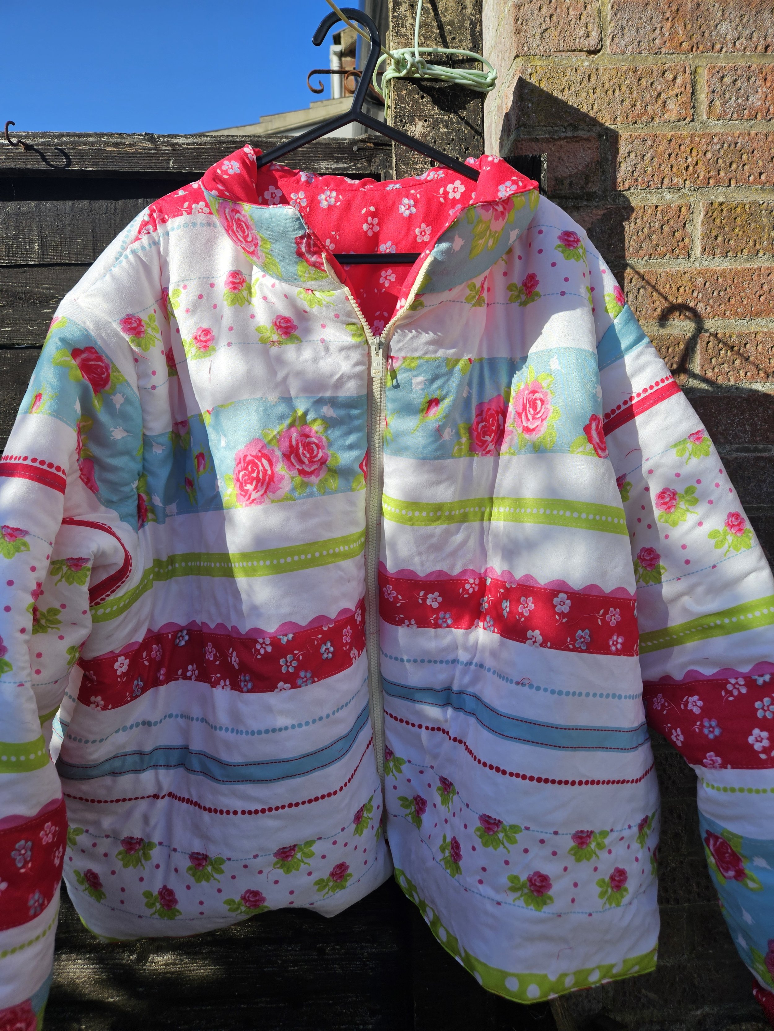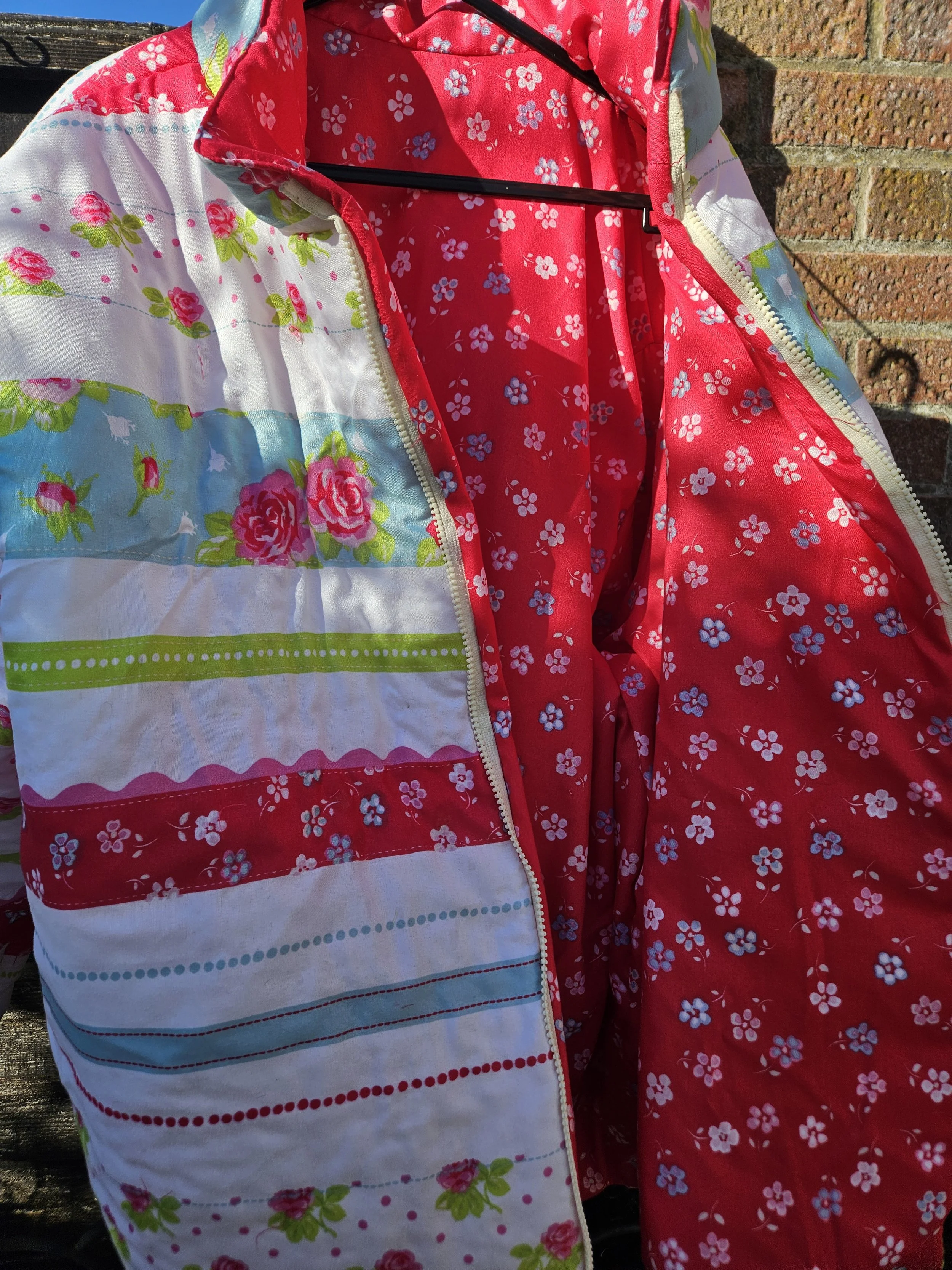 Featuring full front zip fastening with two side pockets ,and cuffs that you may or may not turn up according to your preference . Beautifully lined in co ordinating pink floral fabric . A small collar gives it a lovley finish .