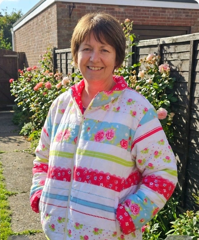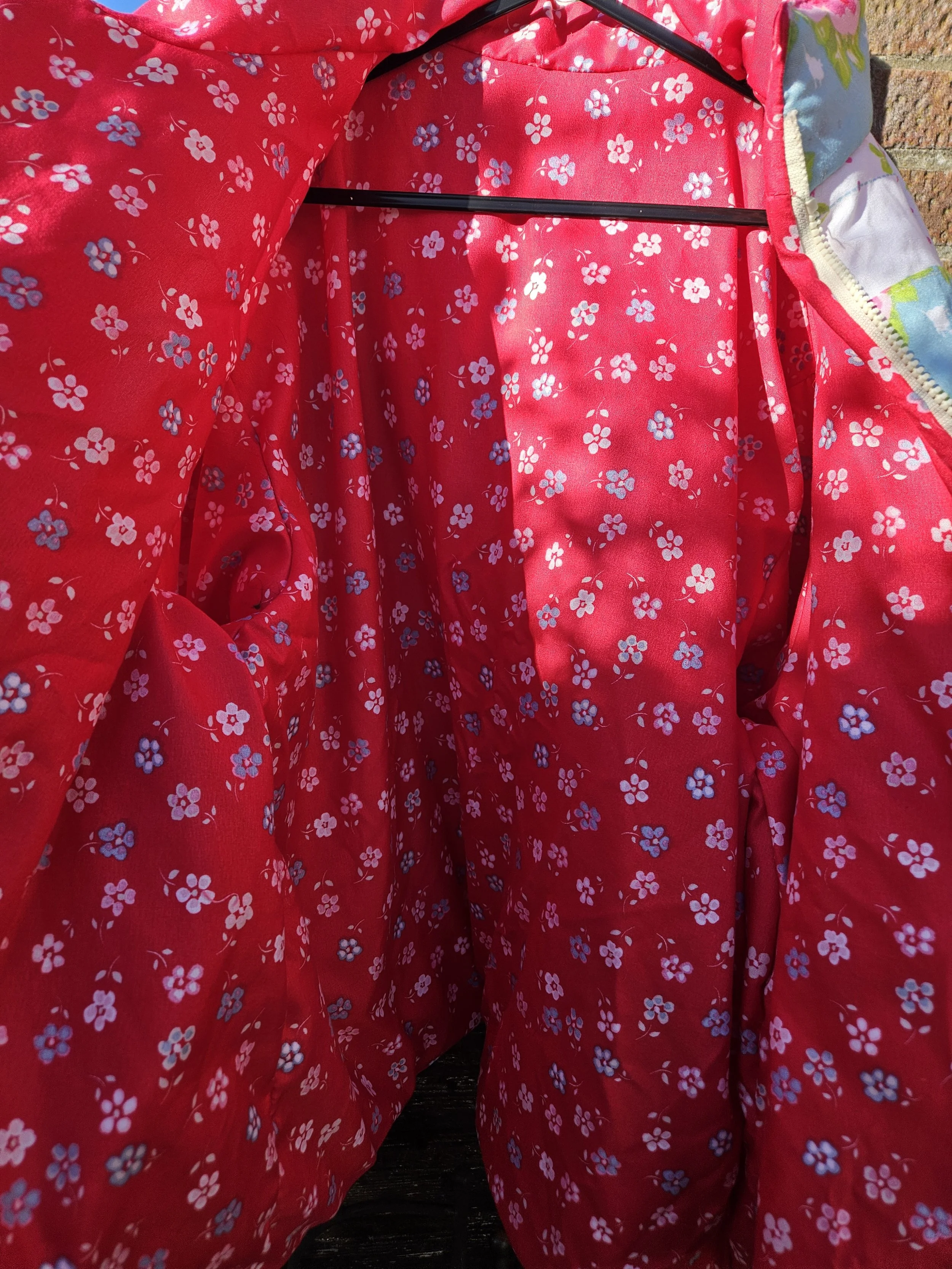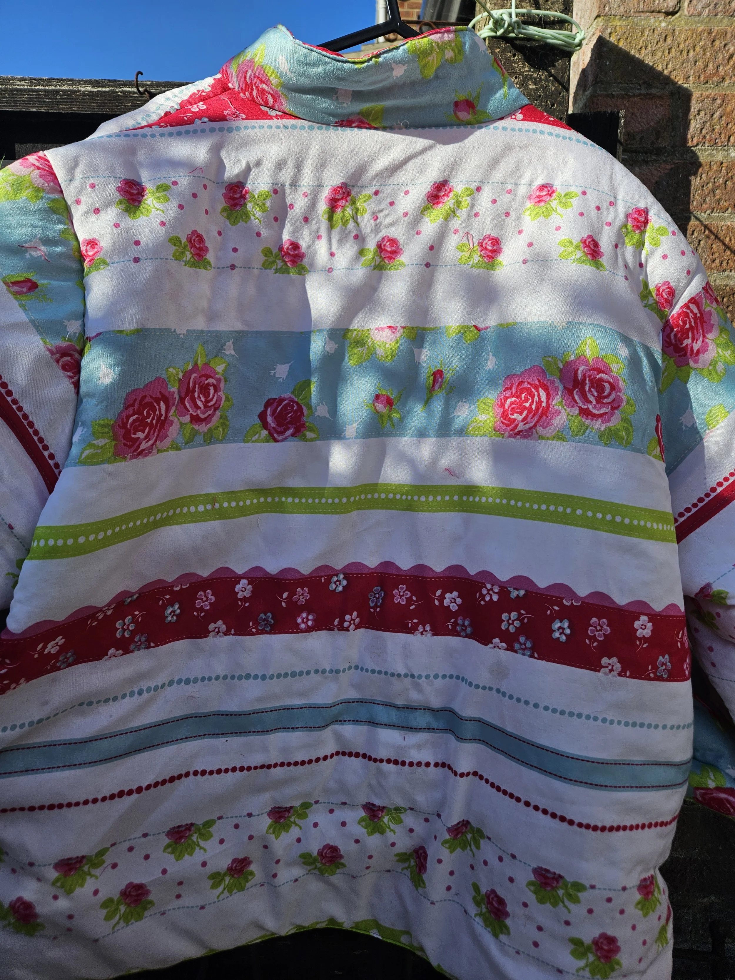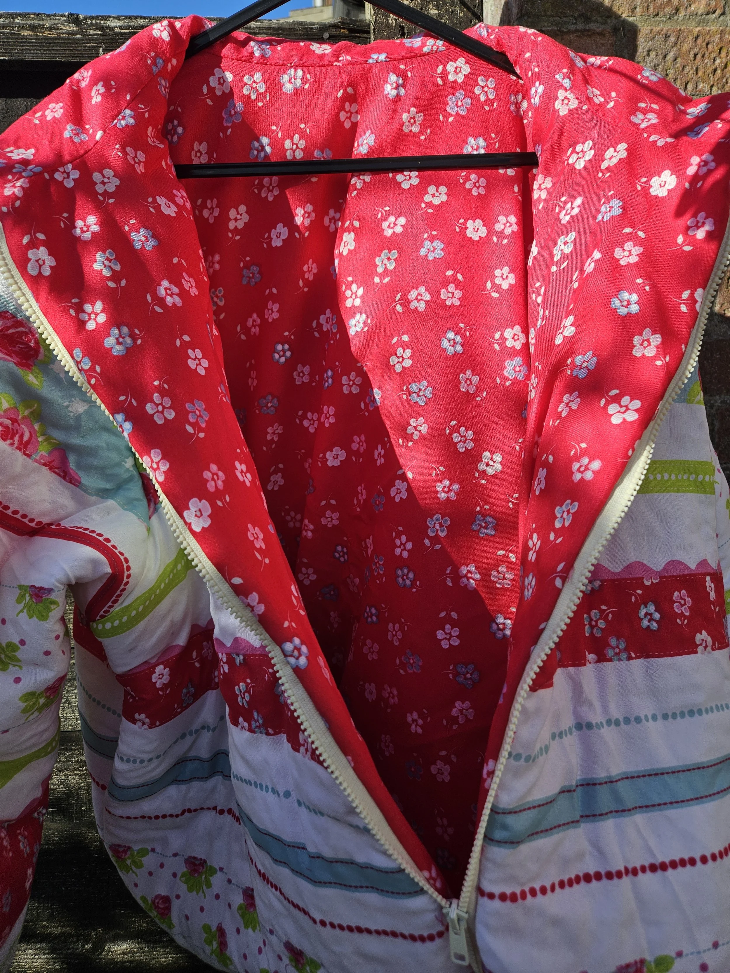 Featuring full front zip fastening with two side pockets ,and cuffs that you may or may not turn up according to your preference . Beautifully lined in co ordinating pink floral fabric . A small collar gives it a lovley finish .