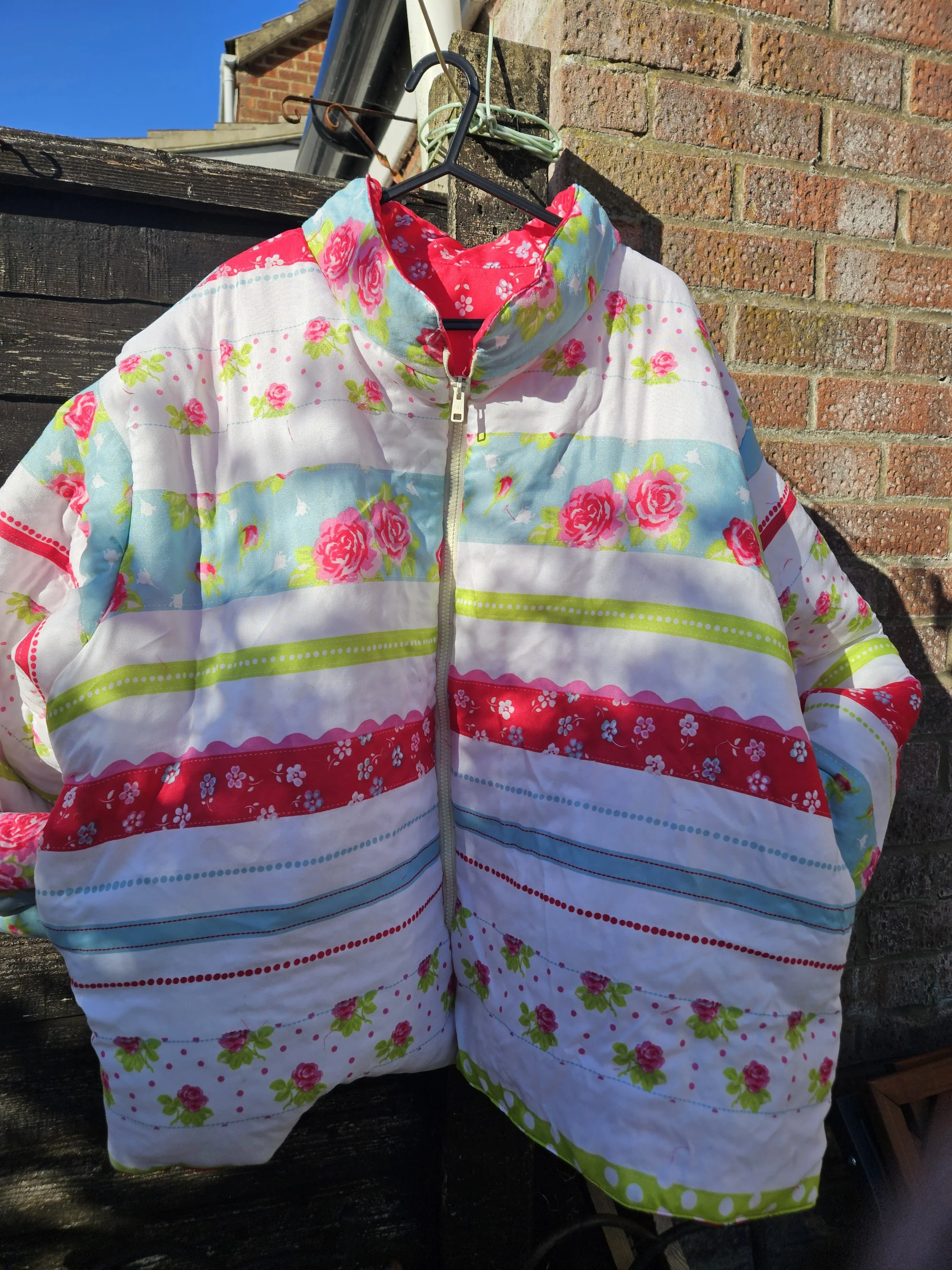 Stunning one of a kind spring floral puffa jacket .