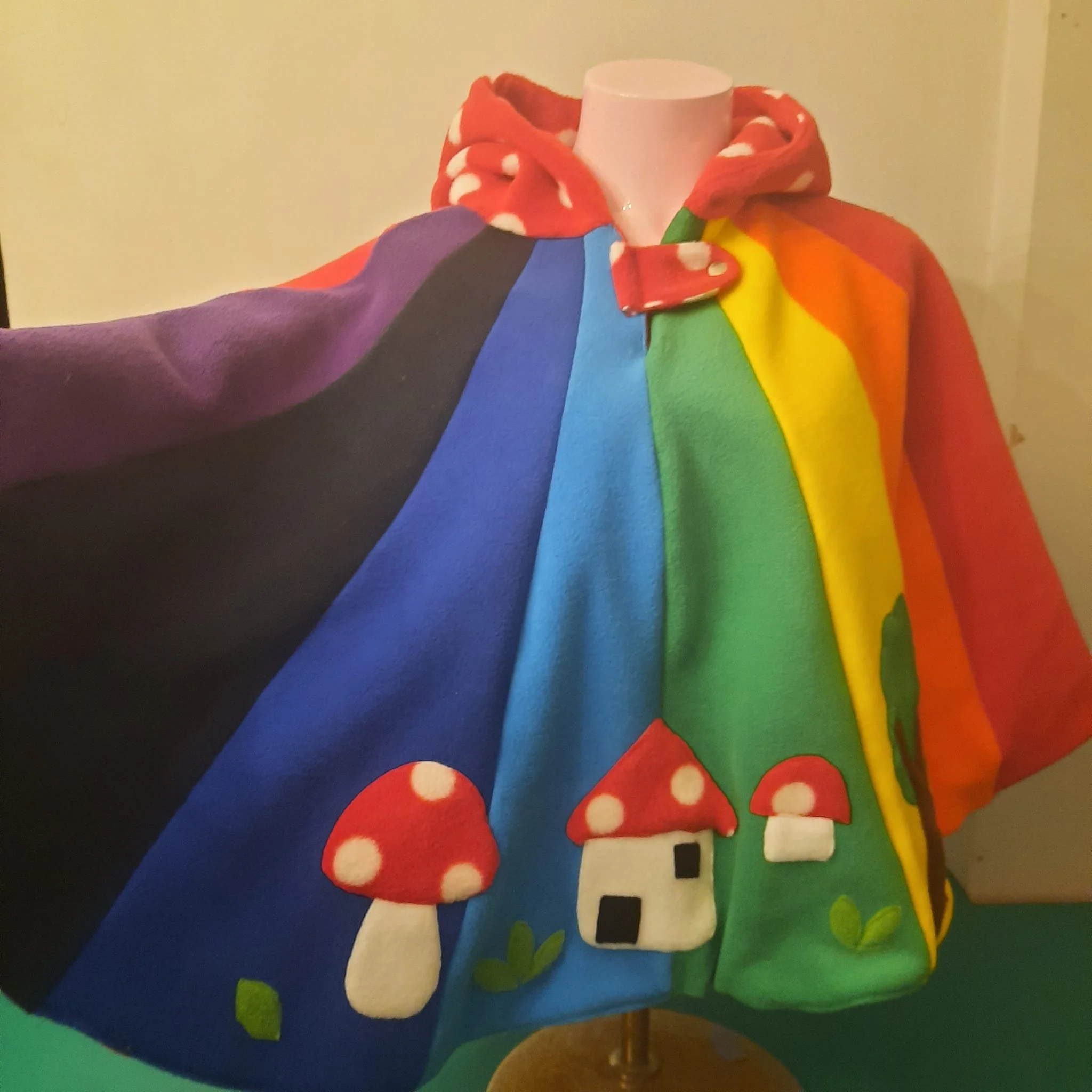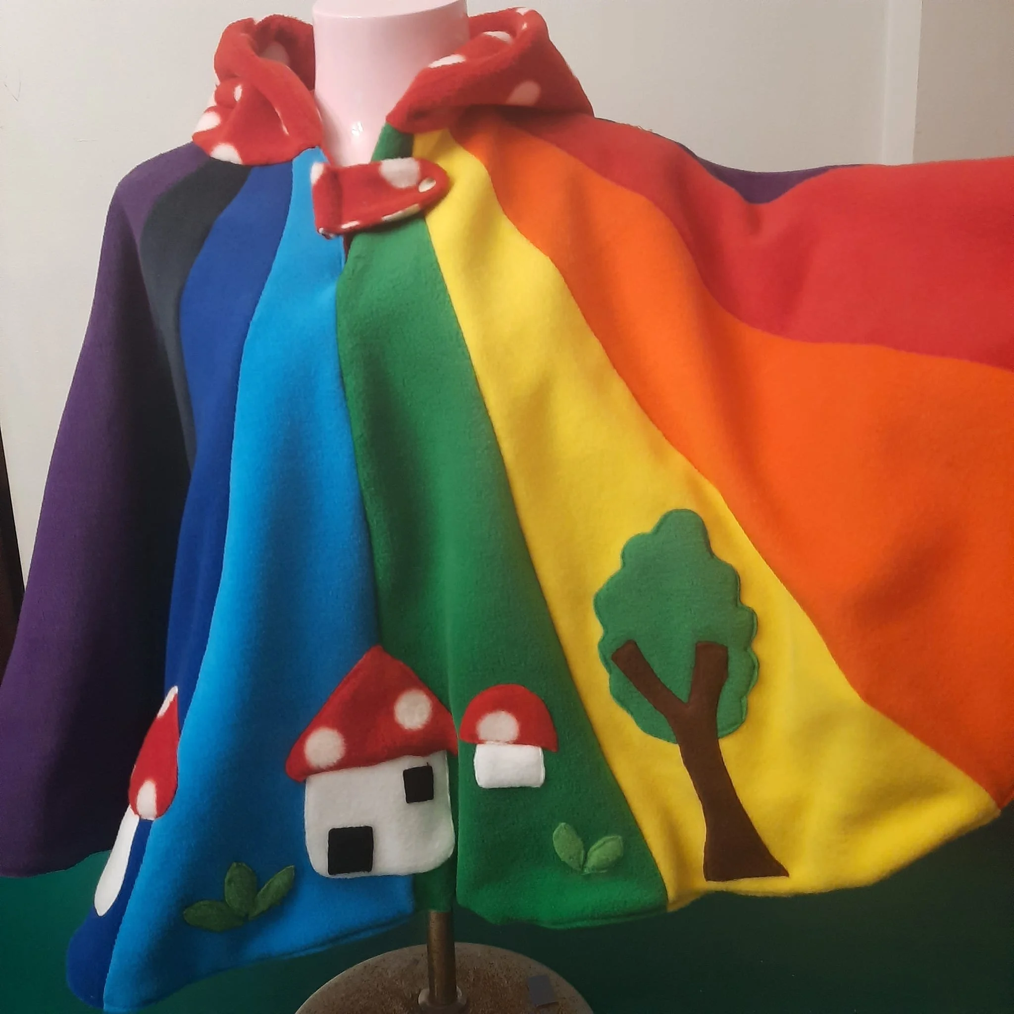wonderfully magical bright rainbow colours with pixie hood detail , little toadstool house tree and toadstool ,pixie hood with bell add a whimsical touch.