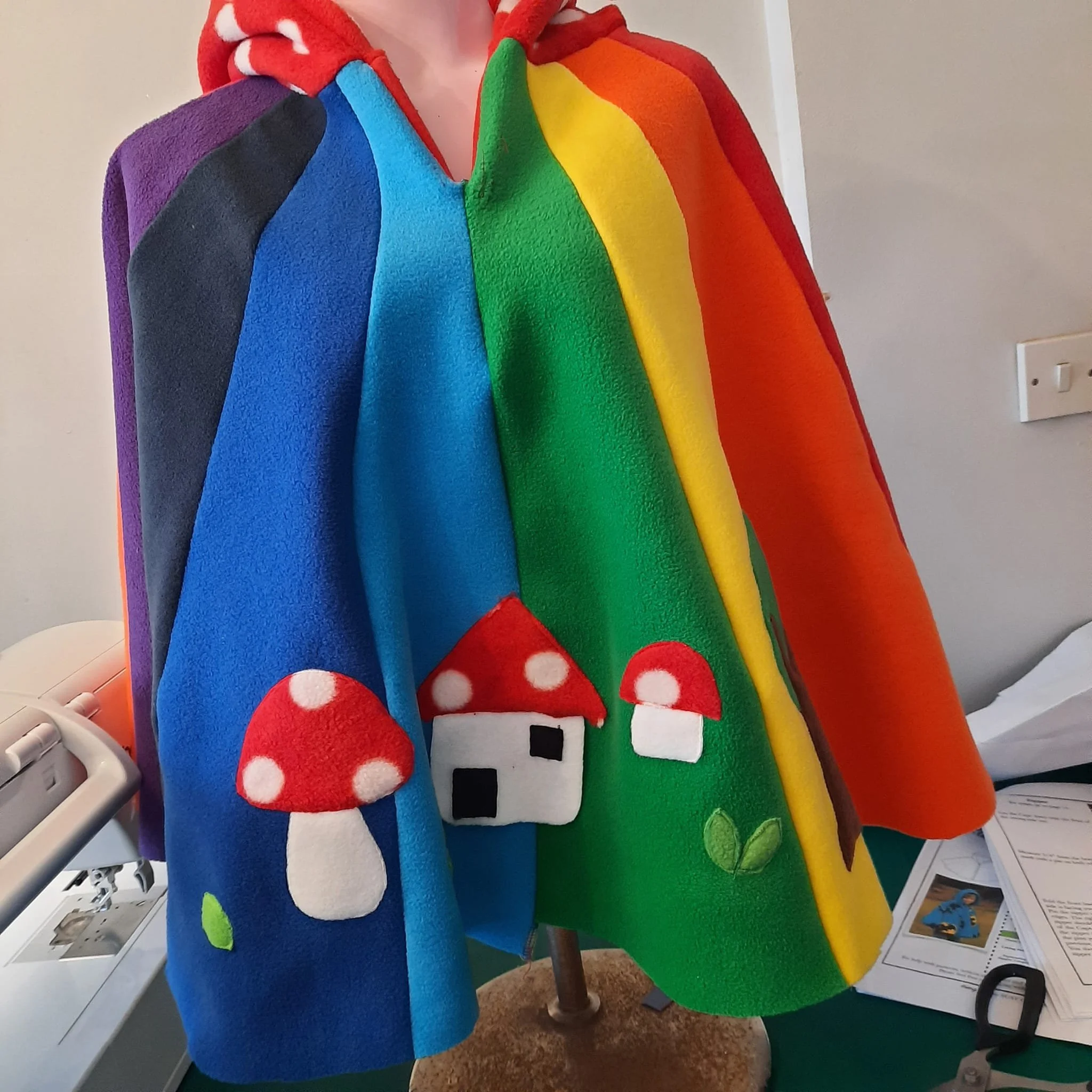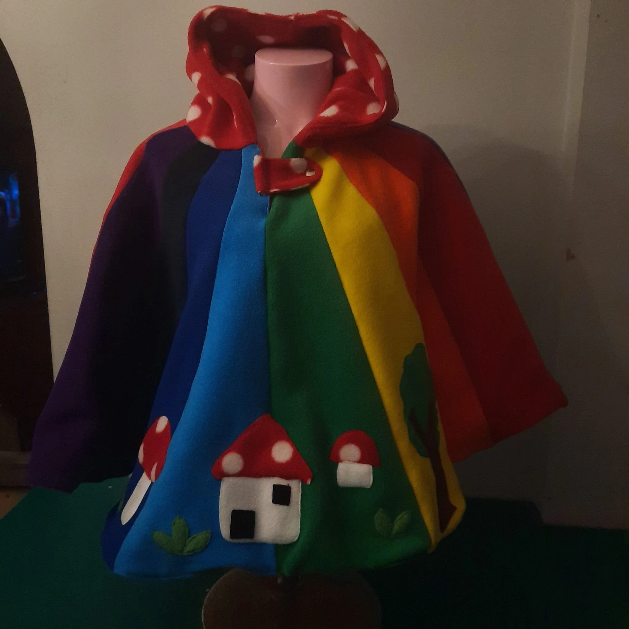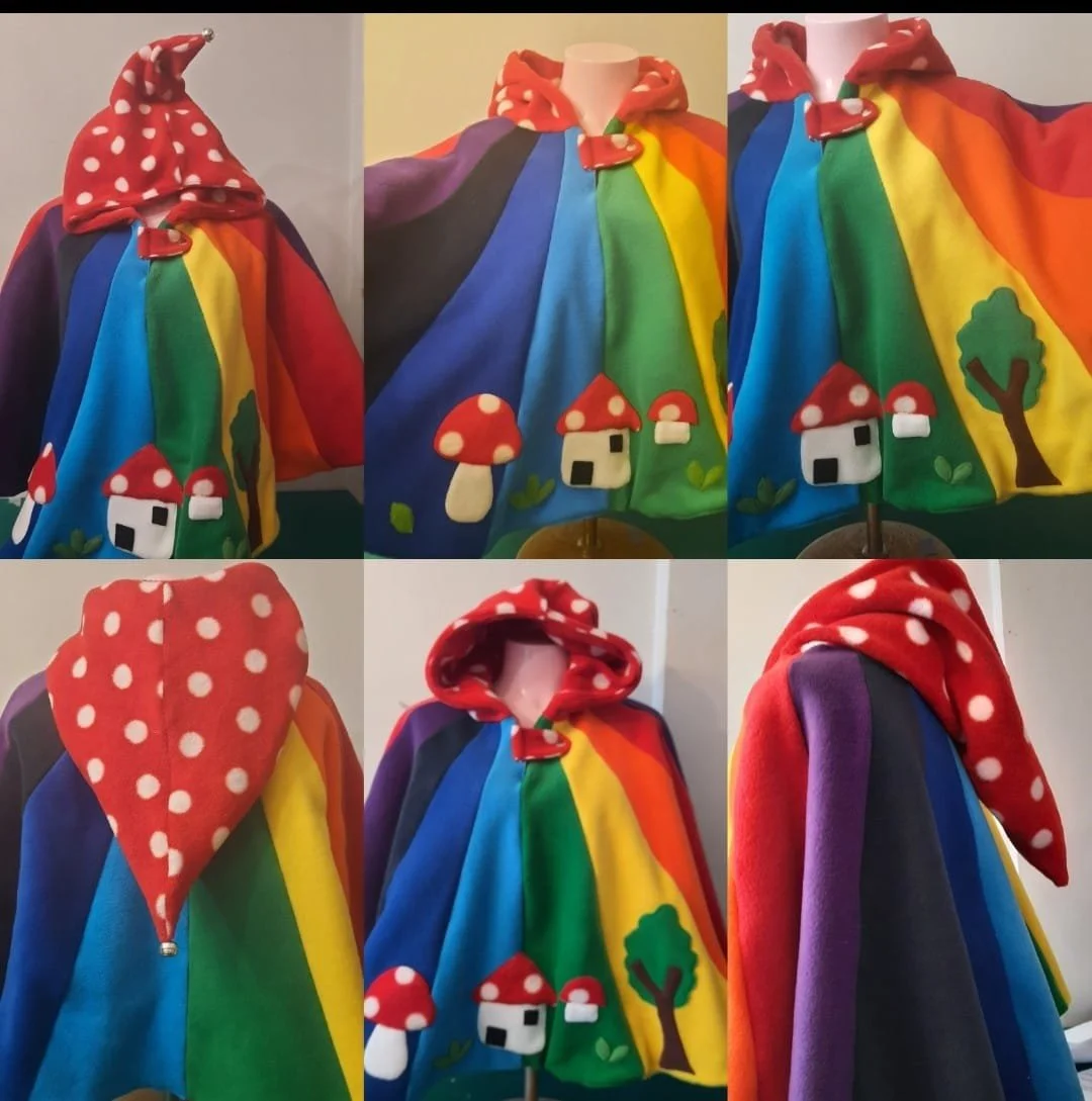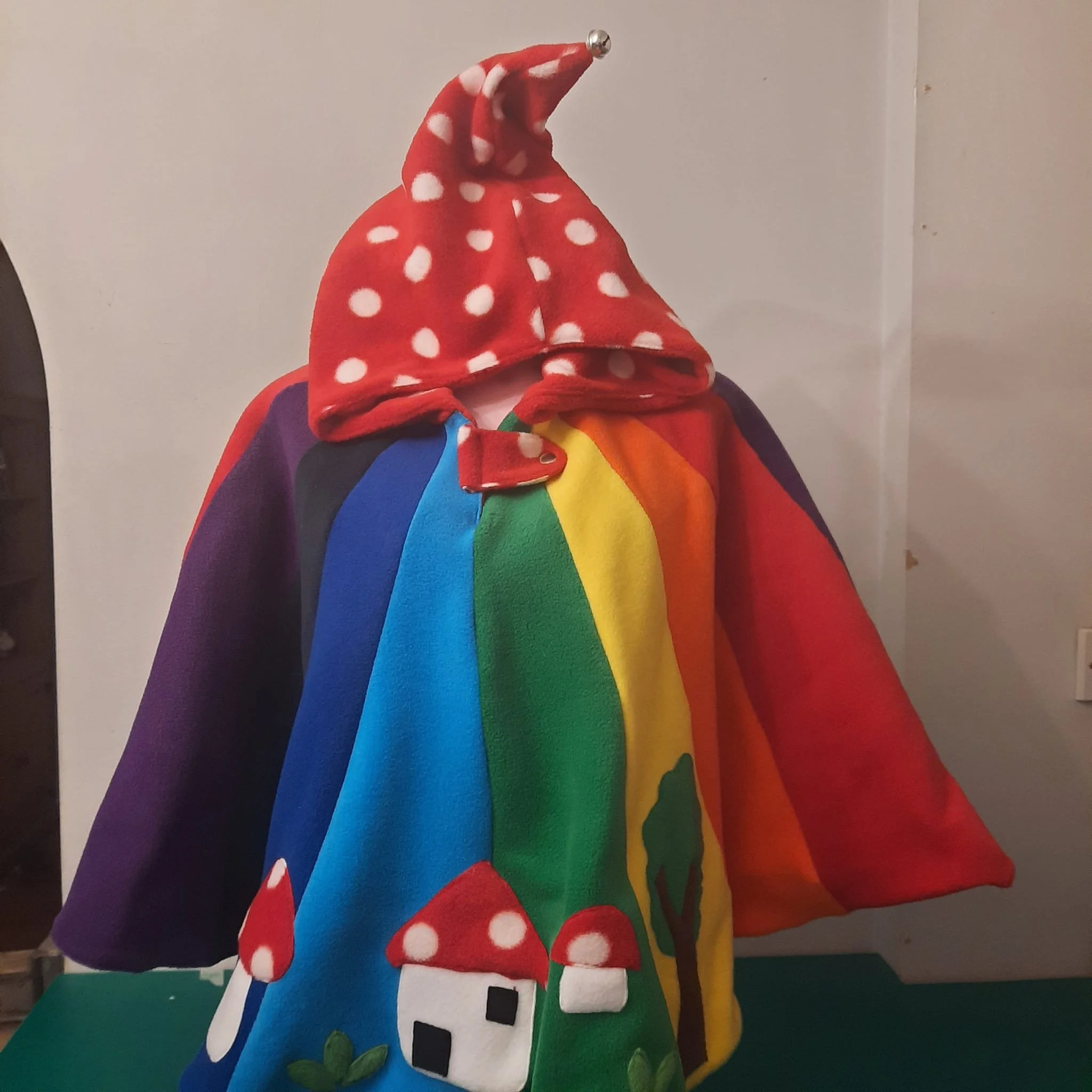 wonderfully magical bright rainbow colours with pixie hood detail , little toadstool house tree and toadstool ,pixie hood with bell add a whimsical touch.